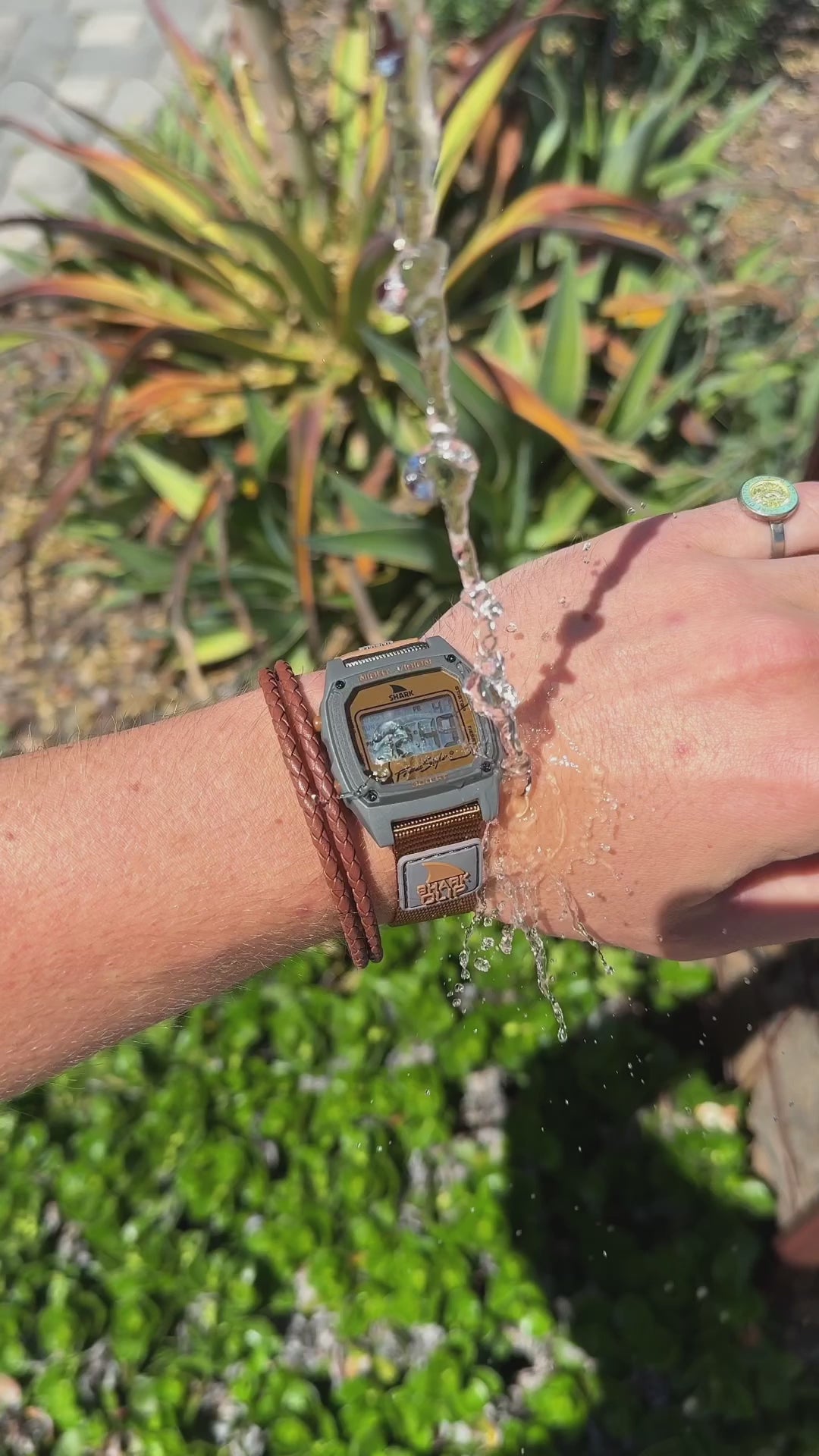 Freestyle SHARK CLASSIC LEASH SAHARA watch: black face, gray strap, water resistant, digital display with numbers and letters.