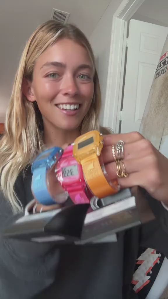 The Freestyle SHARK CLASSIC CLIP SUNSET features a retro square face, a pink-orange strap, and 300ft water resistance.